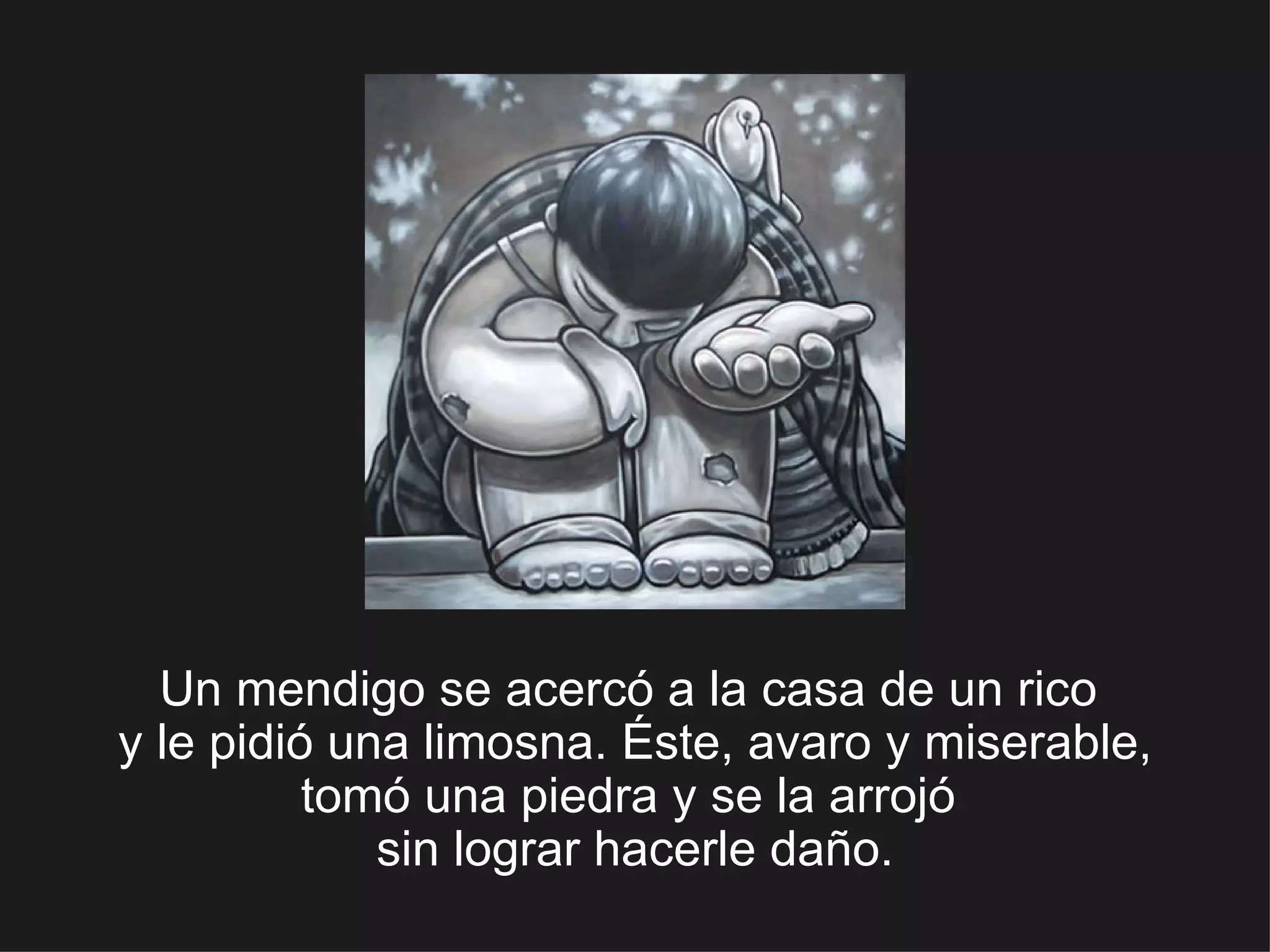 Un mendigo le pidió limosna a un rico avaro que le arrojó una piedra. Años después, el mendigo se hizo rico y el rico cayó en la pobreza y se convirtió en mendigo. Cuando el ahora rico se encontró con su antiguo agresor mendigando, recordó la piedra pero decidió perdonarlo y darle limosna en lugar de devolverle el maltrato.