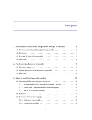 Este documento presenta un curso de cálculo diferencial e integral para estudiantes de primer año de ingeniería de telecomunicaciones. Incluye temas como números reales y complejos, funciones, límites, derivadas, integrales, series y cálculo vectorial. El objetivo es introducir los conceptos y herramientas matemáticas fundamentales necesarias para el análisis y modelado de sistemas físicos.