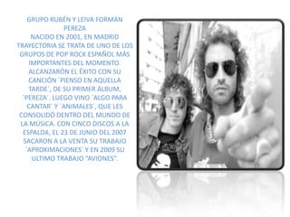 El grupo español de pop rock Pereza se formó en 2001 en Madrid por Rubén y Leiva. Alcanzaron el éxito con su primer álbum homónimo "Pereza" y su canción "Pienso en aquella tarde". Han lanzado 5 álbumes de estudio que los han consolidado como una de las bandas más importantes del pop rock español.