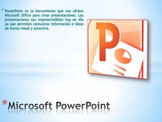 PowerPoint es una herramienta de Microsoft Office que permite crear presentaciones visuales y atractivas para comunicar información e ideas de manera efectiva. Se puede utilizar PowerPoint en la enseñanza, investigación y empresas para exponer temas, resultados y nuevos productos. Ofrece diversas herramientas para personalizar diapositivas con texto, gráficos, imágenes y estilos.