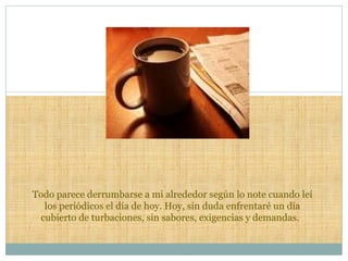 El documento habla sobre la importancia de mantener los pensamientos en Dios para encontrar paz interior a pesar de las malas noticias y circunstancias turbulentas del mundo. Citando Isaías 26:3, explica que aquellos cuyo pensamiento persevera en Dios estarán en paz perfecta. Insta al lector a confiar en Dios y sus promesas en lugar de en las noticias negativas, pues sólo así se encontrará verdadera paz y seguridad.