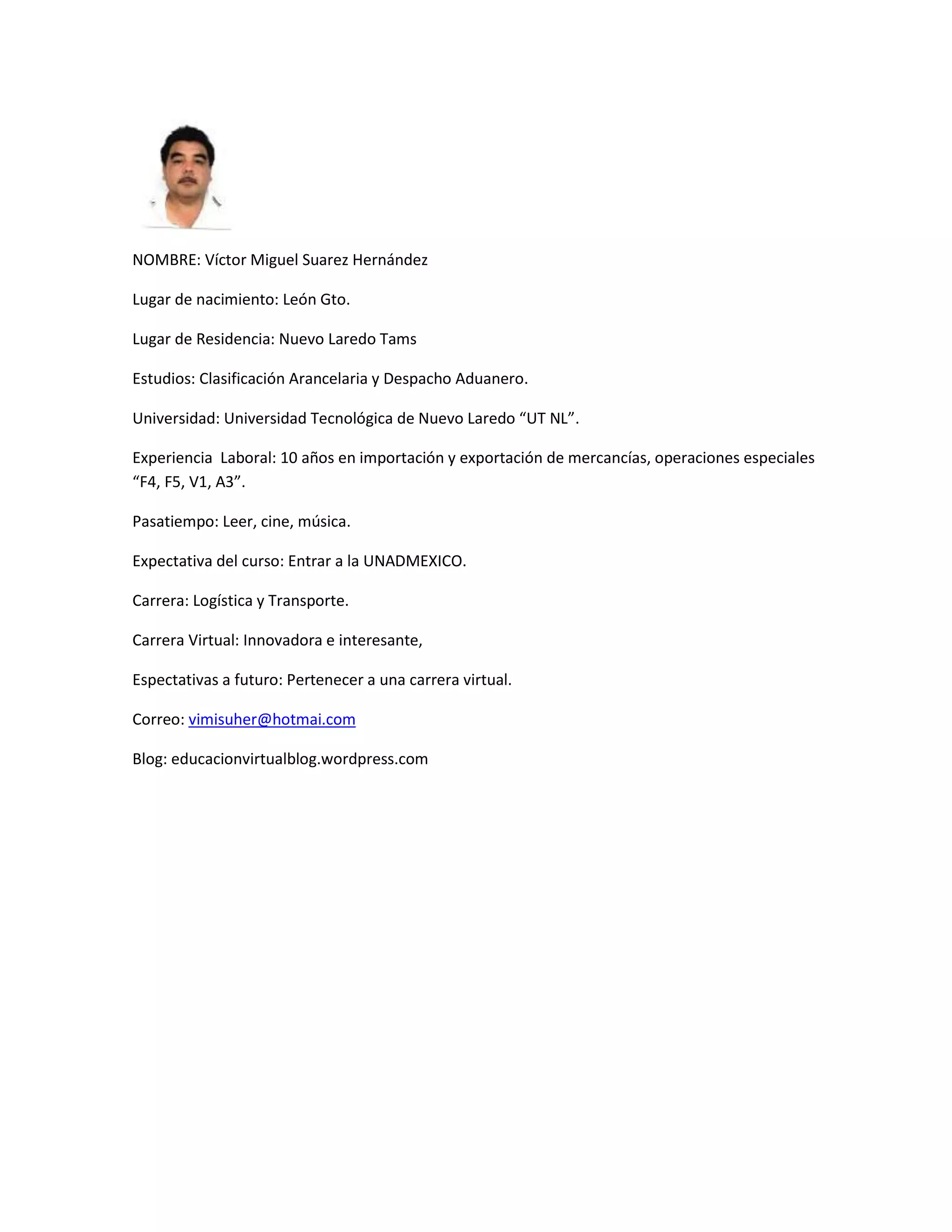 Víctor Miguel Suarez Hernández nació en León Gto. y reside en Nuevo Laredo Tams. Estudió Clasificación Arancelaria y Despacho Aduanero en la Universidad Tecnológica de Nuevo Laredo y tiene 10 años de experiencia en importación y exportación. Su expectativa del curso es entrar a la carrera de Logística y Transporte en UNADMEXICO y pertenecer a una carrera virtual innovadora e interesante.