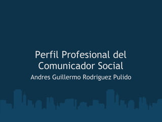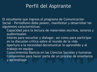 El documento describe el perfil profesional de un comunicador social-periodista de la Universidad Minuto de Dios. El programa forma profesionales competentes para comprender y analizar la realidad social y difundir información de interés público a través de medios de comunicación con un enfoque crítico y de transformación social. Los comunicadores sociales egresados estarán capacitados para planear procesos de investigación periodística, coordinar equipos de trabajo, producir contenidos para diferentes medios y diseñar proyectos de comunicación participativa.