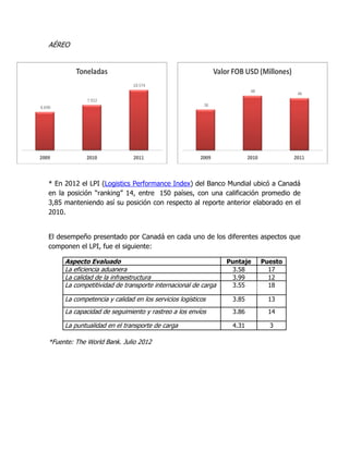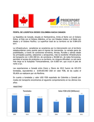Canadá tiene una excelente infraestructura de transporte terrestre, marítimo y aéreo que permite el acceso de productos desde Colombia. Las exportaciones colombianas a Canadá se realizan principalmente por vía marítima a puertos como Halifax, Montreal y Toronto en el este y Vancouver en el oeste. El transporte aéreo usualmente requiere conexiones en Estados Unidos, Panamá o Cuba.