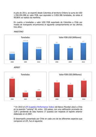 Chile se encuentra en el suroeste de Sudamérica y cuenta con una economía fuerte integrada a nivel mundial. La infraestructura vial e ferroviaria chilena permite el transporte de carga entre Colombia y Chile principalmente por vía marítima e aérea. Los puertos y aeropuertos chilenos importantes facilitan la importación y exportación de bienes entre los dos países.