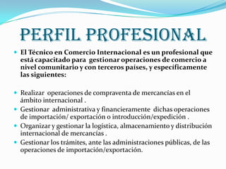 El documento describe el perfil profesional de un Técnico en Comercio Internacional, que está capacitado para gestionar operaciones de compraventa de mercancías a nivel internacional, administrar dichas operaciones financiera y logísticamente, y gestionar los trámites aduaneros. El Técnico en Comercio Internacional podría desempeñar roles como Coordinador de compras internacionales, Jefe de importaciones y exportaciones, o Coordinador de logística internacional.