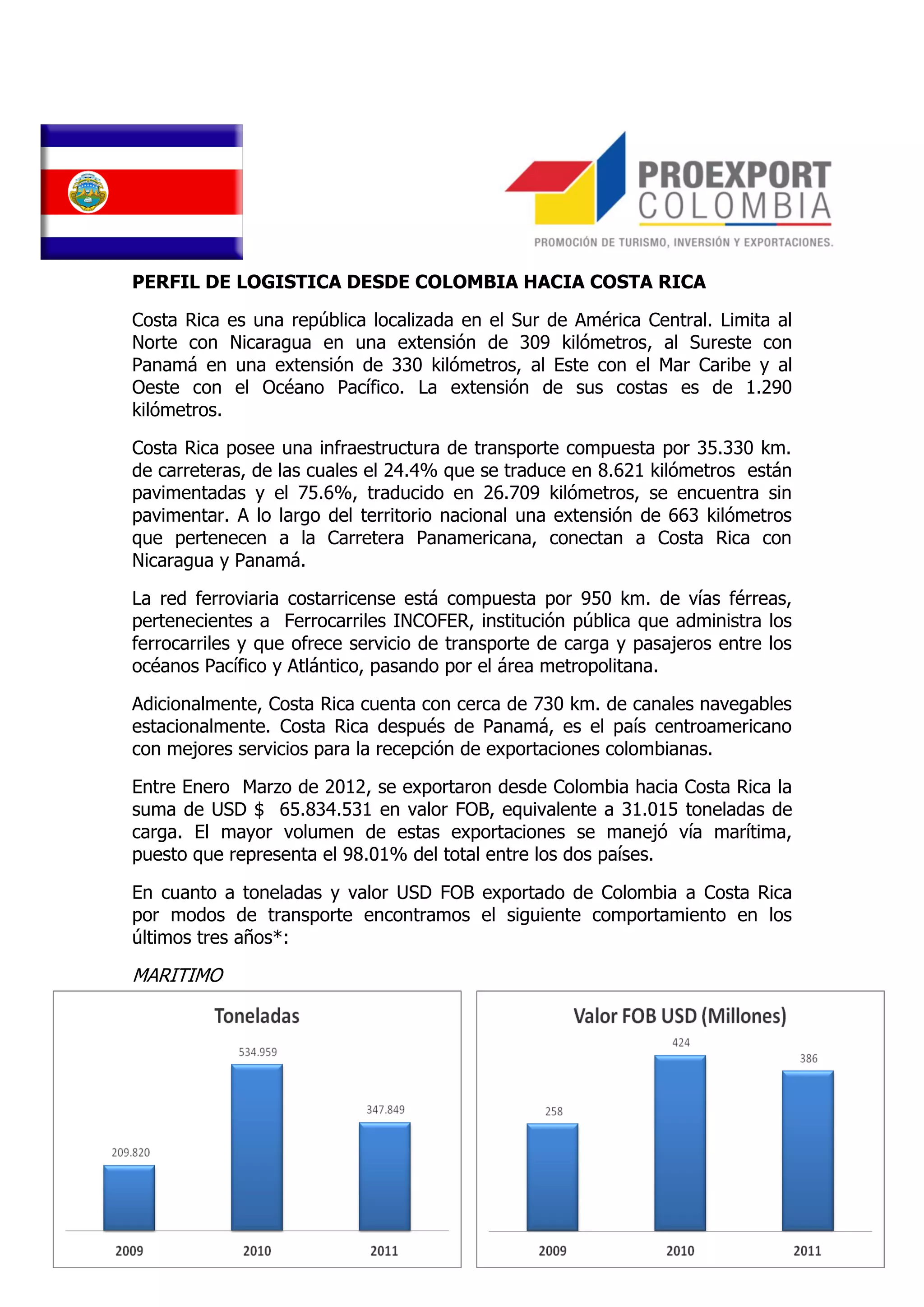 Este documento presenta información sobre la logística de exportación desde Colombia hacia Costa Rica, incluyendo detalles sobre la infraestructura de transporte de Costa Rica, modos de transporte disponibles como vía marítima, aérea y terrestre, puertos y aeropuertos clave, tiempos de tránsito, líneas navieras y aerolíneas, y requisitos aduaneros y fitosanitarios.
