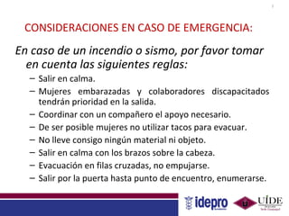 El documento aborda dos temas principales: las consideraciones de seguridad en situaciones de emergencia, como incendios o sismos, y la importancia de las competencias laborales para el desempeño exitoso en el trabajo. Se describen diferentes modelos y tipos de competencias, así como métodos para su desarrollo y evaluación. Además, se enfatiza la necesidad de preparación y coordinación en la evacuación, y se detalla cómo las competencias involucran conocimientos, habilidades y actitudes.