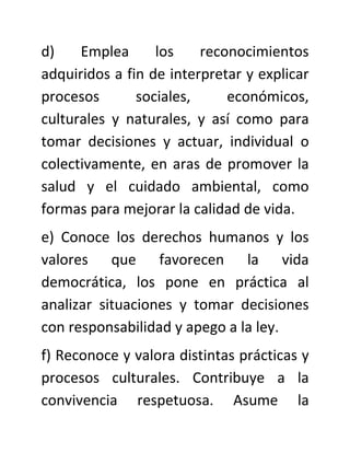 El documento describe las competencias que se espera desarrollen los estudiantes en diferentes áreas como: aprendizaje permanente, manejo de información, manejo de situaciones, convivencia y vida en sociedad. Asimismo, presenta técnicas de estudio como ensayo, elaboración y organización que permiten procesar y comprender mejor la información.