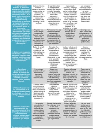 El documento presenta un perfil de egreso para una carrera en psicología. Incluye competencias genéricas, básicas, extendidas y compromisos de acción en áreas física, cognitiva, socioemocional y espiritual. El egresado se compromete a aplicar métodos éticos y efectivos para diagnosticar, tratar y prevenir problemas psicológicos, comunicar e investigar temas de la profesión, y contribuir al bienestar de las personas a lo largo de la vida considerando principios cristianos.