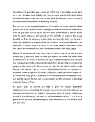 El grupo está compuesto por 31 estudiantes de segundo grado, la mayoría entre las edades normales excepto uno que fue reprobado. Cinco estudiantes tienen necesidades especiales como TDAH o hiperactividad. La mayoría aprende visualmente pero se deben considerar otros estilos. Algunos practican deportes después de clase mientras que otros solo usan la televisión o juegos. El desarrollo motor y lingüístico es adecuado para la edad aunque dos hablan mimado. Los estudiantes resuelven problemas y aprenden vincularlo a