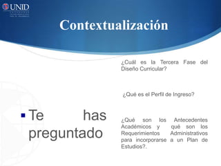 Este documento describe la tercera fase del diseño curricular, el Perfil de Ingreso. El Perfil de Ingreso identifica los conocimientos, habilidades y actitudes deseables que debe poseer un aspirante para incorporarse a un plan de estudios. Incluye los antecedentes académicos formales requeridos y los requerimientos administrativos que debe cumplir el aspirante. El Perfil de Ingreso sirve como criterio de selección y parámetro para regularizar a los estudiantes que ingresan al programa educativo.