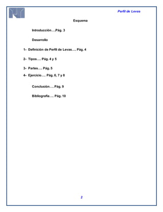 Este documento describe los perfiles de levas, incluidas sus definiciones, tipos, partes y un ejemplo de cálculo. Un perfil de leva es un elemento mecánico diseñado para generar un movimiento determinado en un seguidor a través del contacto directo. Existen varios tipos de levas como cilíndricas, cónicas y de disco. Las levas constan de un eje, un perfil y un seguidor. El documento presenta un ejercicio para calcular la trayectoria de una leva que levanta cajas en interval