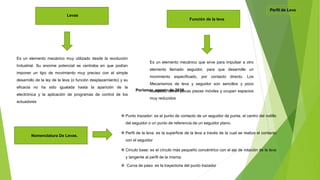 Este documento proporciona información sobre las levas, incluyendo su definición, tipos, aplicaciones y métodos de diseño. Explica que una leva es un elemento mecánico que transmite movimiento a otra pieza llamada seguidor, y describe levas radiales, axiales y sus usos comunes como en motores de combustión interna y lavadoras. También resume los pasos clave en el diseño de levas como determinar las especificaciones de movimiento requeridas y asegurar la continuidad en la posición, velocidad y aceleración del seguid