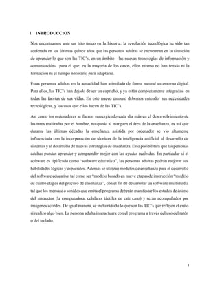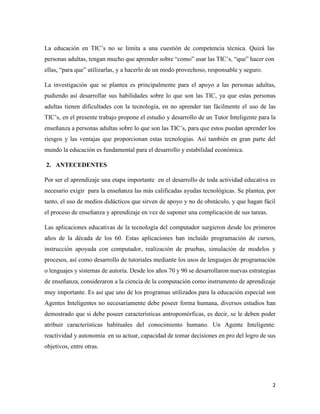 Este documento presenta la necesidad de desarrollar un sistema tutor inteligente para mejorar la enseñanza de las tecnologías de la información y la comunicación (TIC) a las personas adultas. Identifica varios problemas como la falta de interés de las personas adultas por aprender sobre las TIC y la falta de campos de aprendizaje. El objetivo general es desarrollar un sistema tutor inteligente que mejore la enseñanza de las TIC a las personas adultas, con objetivos específicos como mejorar el acceso a la información sobre las TIC y log
