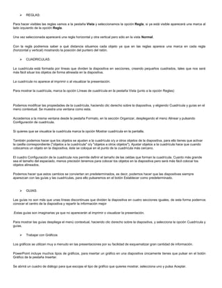 El documento proporciona instrucciones para crear una presentación de PowerPoint efectiva. Explica 7 condiciones clave para una buena presentación, incluida la reducción del número de diapositivas, elegir un tamaño de fuente adecuado, simplificar el texto, usar controles visuales, etiquetar gráficos de manera comprensible, aplicar fondos sutiles y coherentes, y revisar la ortografía y gramática. También resume herramientas útiles de PowerPoint como reglas, cuadrículas, guías y cómo trabajar
