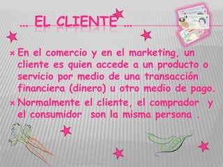 El documento habla sobre los conceptos básicos de clientes, segmentación de mercados y mercado meta. Define al cliente como quien accede a un producto o servicio a través de una transacción financiera. Explica que la segmentación de mercados consiste en dividir el mercado total en grupos más pequeños con necesidades similares. Para elegir el mercado meta, se deben identificar variables de segmentación, caracterizar los segmentos y evaluar cuál es el más atractivo para el producto.