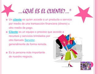 Un cliente es quien accede a un producto o servicio mediante una transacción financiera u otro medio de pago. Los clientes son importantes para un negocio y las empresas segmentan el mercado en grupos más pequeños de consumidores que reaccionan de manera similar a las estrategias de marketing para elegir un mercado meta. Las empresas identifican variables de segmentación, caracterizan los segmentos, evalúan el más atractivo y posicionan el producto en ese segmento elegido.