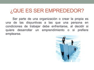 Este documento describe lo que significa ser emprendedor y las diferencias entre tipos de emprendedores y emprendimientos. Ser emprendedor implica crear su propia organización en lugar de emplearse. Si bien todos los emprendedores y emprendimientos buscan alcanzar una meta a través de la planificación y las ideas, los emprendedores tienen proyectos ya planificados desde el inicio, mientras que los emprendimientos se enfocan en iniciar y crear proyectos a partir de diferentes ideas y oportunidades.