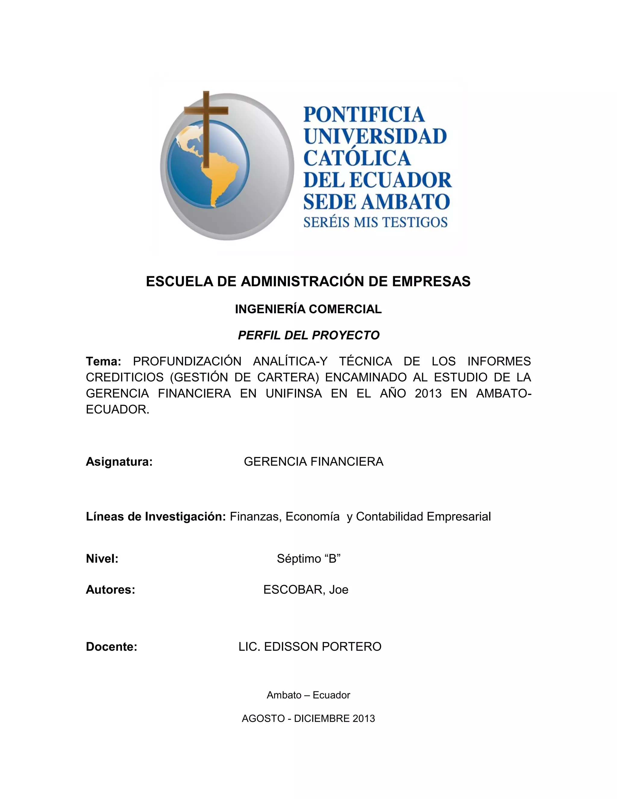Este documento presenta un proyecto de investigación sobre el análisis técnico de informes crediticios y su relación con la gestión de cartera y la gerencia financiera en UNIFINSA en 2013. El proyecto tiene como objetivo principal ejecutar un análisis técnico de los informes crediticios en relación a la gestión de cartera para estudiar la gerencia financiera de UNIFINSA. Los objetivos específicos incluyen indagar técnicas para usar informes crediticios, formular técnicas de gestión de cartera