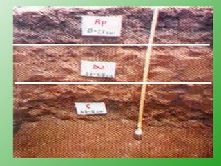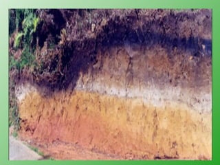 El documento describe los componentes y estructura del perfil del suelo. Define el suelo como un sistema de tres fases: sólido, líquido y gaseoso; y cuatro componentes: mineral, orgánico, agua y aire. Explica que un perfil de suelo típicamente contiene varios horizontes, incluyendo el horizonte A en la parte superior con más materia orgánica, el horizonte E debajo del A con menos sustancias debido a la lixiviación, y el horizonte B en la parte media generalmente con más arcilla y de colores más