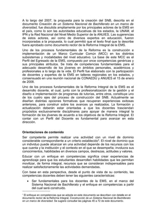 Este documento presenta el perfil del docente de educación media superior en México. Define las competencias que los docentes deben poseer para apoyar integralmente la formación de los estudiantes más allá de la transmisión de conocimientos. Explica que las competencias docentes deben estar alineadas con el perfil del egresado y permitir que los estudiantes desarrollen las competencias genéricas definidas en la reforma educativa. Además, orienta que las competencias docentes deben ser fundamentales para el contexto, transversales a distintas disciplinas y conducent