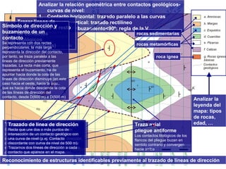 El documento describe los procedimientos para trazar contactos geológicos y estructuras en un mapa geológico y representarlos en un corte geológico. Explica cómo analizar la relación geométrica entre contactos y curvas de nivel, y cómo dibujar líneas de dirección, símbolos de dirección y buzamiento, discordancias, pliegues, diques, fallas y la columna estratigráfica.