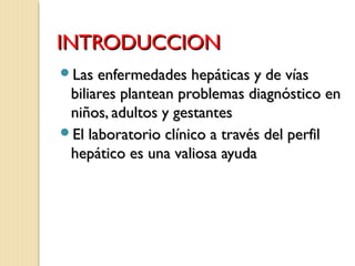 Este documento describe el perfil hepático, que incluye pruebas de laboratorio clave para evaluar las enfermedades hepáticas y biliares. Explica cada parámetro de prueba como la bilirrubina, las proteínas séricas, las transaminasas, la fosfatasa alcalina y el tiempo de protrombina. También proporciona valores de referencia normales y anormales y patrones típicos de resultados de pruebas para diferentes afecciones hepáticas como hepatitis aguda y crónica, cirrosis y colestasis.