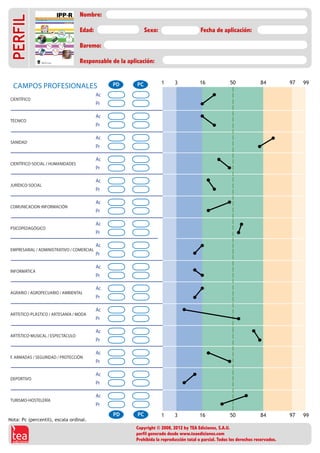 El documento presenta los resultados de una prueba de perfil profesional realizada a una persona. La prueba evaluó su afinidad con 16 campos profesionales comunes y generó puntajes percentil para cada uno, indicando su mayor afinidad con campos científico-social/humanidades, psicopedagógico y empresarial/administrativo/comercial.