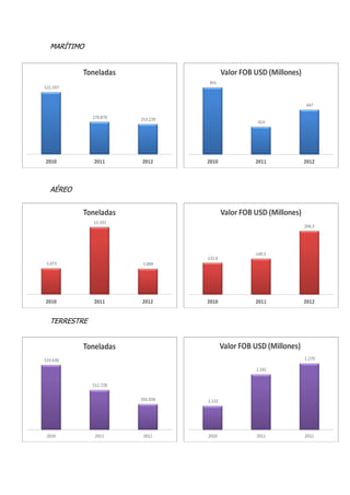 Este documento describe la logística del transporte de mercancías desde Colombia a Ecuador. Ecuador limita al norte con Colombia. Las exportaciones más importantes de Colombia a Ecuador incluyen cosméticos, petróleo y derivados, vehículos, textiles y productos agroindustriales. La mayor parte de la carga se transporta por vía terrestre a través de la carretera Panamericana. El puerto marítimo principal es Guayaquil, al que llegan barcos desde varios puertos colombianos.
