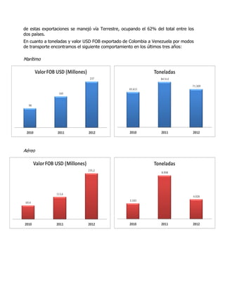 Este documento resume la logística para el transporte de mercancías desde Colombia hacia Venezuela. Venezuela posee una extensa red de carreteras, puertos marítimos y aeropuertos internacionales que facilitan el comercio. El modo de transporte terrestre es el más importante para el intercambio comercial con Colombia, utilizando la carretera Panamericana a través de los puentes internacionales. El documento también describe los diferentes requisitos aduaneros y documentales necesarios para la importación de mercancías a Venezuela.