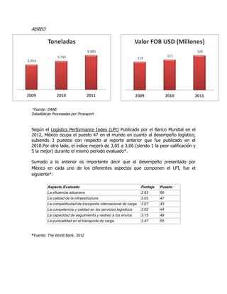México es un importante mercado para las exportaciones colombianas. El documento describe las rutas marítimas y aéreas entre Colombia y México, destacando que la mayoría de las exportaciones colombianas a México se transportan por vía marítima a puertos mexicanos en el Golfo de México y el Océano Pacífico. También analiza los tiempos de tránsito y frecuencias de las diferentes rutas de transporte entre los dos países.