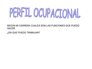 Este documento describe el perfil profesional de una persona y las posibilidades laborales según su carrera. Explica por qué eligió su carrera, las funciones que puede desempeñar y las competencias adquiridas, además de en qué áreas puede trabajar de acuerdo a su perfil ocupacional.