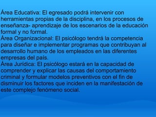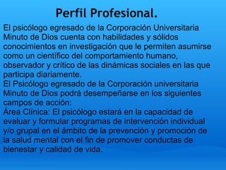 El documento describe las habilidades y áreas de desempeño de un psicólogo egresado de la Corporación Universitaria Minuto de Dios. El psicólogo tiene sólidos conocimientos en investigación que le permiten observar y analizar las dinámicas sociales. Puede desempeñarse en áreas clínicas, educativas, organizacionales, jurídicas y comunitarias diseñando e implementando programas para la salud mental, procesos educativos, desarrollo humano y prevención de problemas sociales.