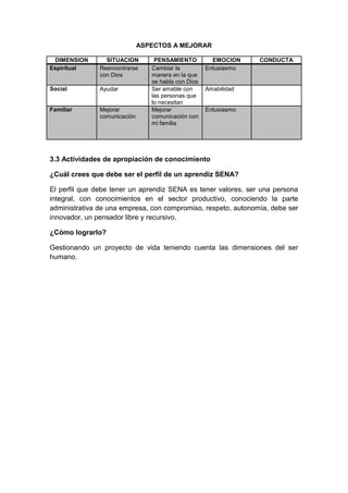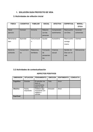 Este documento presenta las actividades iniciales de reflexión para un proyecto de vida, incluyendo actividades de reflexión, contextualización y apropiación de conocimiento. Propone reflexionar sobre siete dimensiones del ser humano (física, cognitiva, familiar, social, afectiva, espiritual y ética) y realizar ejercicios para mejorar aspectos positivos y negativos en cada dimensión. Luego, contextualiza aspectos positivos y negativos actuales y propone mejorar la espiritualidad, ayuda social y comunicación familiar. Finalmente, presenta un