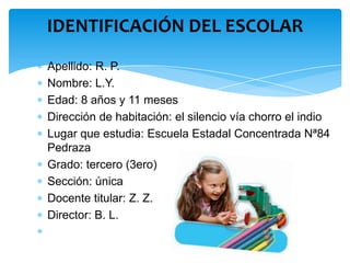 Este documento presenta el perfil psicofuncional de una niña de 8 años y 11 meses llamada L.Y.R.L. que estudia en tercer grado. Incluye una tabla con las diferentes psicofunciones evaluadas como control postural, coordinación, lateralidad, memoria y más. Muestra el nivel de desarrollo alcanzado por la niña en cada área en comparación con su edad cronológica. El objetivo es identificar las dificultades de aprendizaje de la estudiante para brindar el apoyo necesario.