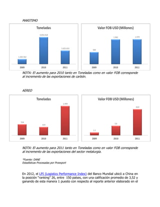 China es el país más poblado del mundo y cuenta con una extensa infraestructura de transporte terrestre y marítima que facilita el comercio internacional. La mayoría de las exportaciones colombianas hacia China, que han aumentado en los últimos años especialmente en carbón y metalurgia, son transportadas por vía marítima a través de varios puertos chinos. Existen múltiples opciones de transporte marítimo directo o con conexiones desde puertos colombianos que toman entre 25 a 60 días.