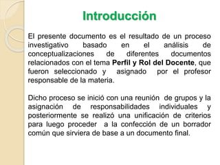 El documento describe el perfil y rol del docente. Explica que el rol principal del docente es facilitar el aprendizaje de los estudiantes mediante la promoción de experiencias acordes a su nivel de desarrollo. También destaca la importancia de que los docentes cuenten con las cualidades adecuadas y necesidades fundamentales para desempeñar bien su labor.