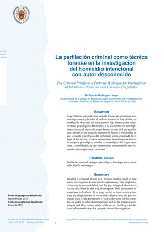 La perfilación criminal es una técnica forense que, aunque no identifica al autor de un homicidio intencional, describe sus características psicológicas para reducir el número de sospechosos. Se basa en el análisis del comportamiento y la interacción entre la víctima y el agresor, utilizando métodos como la autopsia psicológica y el estudio de la escena del crimen. Esta herramienta es vital en investigaciones donde existen múltiples pistas y puede ayudar en la preparación de interrogatorios y en la justificación de pruebas.