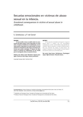 Este documento analiza las consecuencias a corto y largo plazo del abuso sexual infantil. A corto plazo, la mayoría de las víctimas experimentan consecuencias psicológicas negativas como ansiedad, depresión y problemas de comportamiento. A largo plazo, al menos el 30% de las víctimas pueden desarrollar problemas como disfunciones sexuales, depresión y estrés postraumático. El impacto depende de factores como la frecuencia y gravedad del abuso, la relación con el agresor y el apo