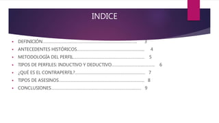 Este documento define el perfil criminal como una técnica para identificar las características de personalidad y comportamiento de delincuentes. Explica los antecedentes históricos de la práctica desde 1870 y los diferentes tipos de perfiles inductivos y deductivos. Además, introduce el concepto de contraperfil y tipos de asesinos organizados y desorganizados. Finalmente, concluye que el perfil criminal siempre ha tenido como objetivo inferir características delictivas para investigaciones criminales.