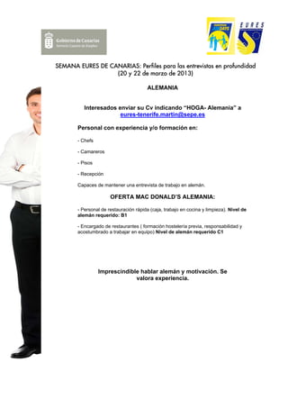 El documento describe los perfiles requeridos para entrevistas de trabajo en Alemania en la semana EURES de Canarias, incluyendo chefs, camareros, personal de pisos, recepción, y personal para McDonald's con experiencia en restauración rápida, caja, cocina o limpieza y para encargados de restaurantes con formación y experiencia previa en hostelería. Se requiere hablar alemán y tener motivación para los puestos.