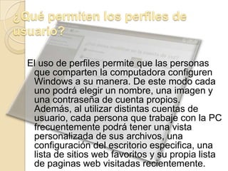 Los perfiles de usuario permiten que cada persona que use una computadora configure su propia cuenta con un nombre, imagen y contraseña únicos, y tenga una configuración y lista de favoritos personalizados. Se pueden crear perfiles en el Panel de Control y existen cuentas administrativas y limitadas. Las opciones como la imagen y contraseña pueden modificarse, y se puede cambiar fácilmente entre usuarios o cerrar sesión.