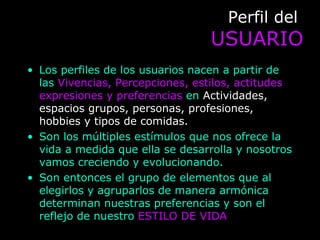 El documento describe diferentes perfiles de usuarios, incluyendo el perfil tradicional, neo-tradicional, contemporáneo, de moda, exhibicionista, y étnico. Cada perfil se caracteriza por sus preferencias de vestuario, espacios de vida, y profesiones típicas.