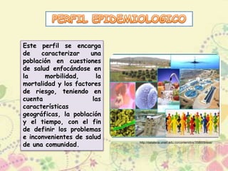 Este documento describe el perfil epidemiológico, el cual se encarga de caracterizar una población en términos de salud mediante el estudio de la morbilidad, mortalidad y factores de riesgo. Los objetivos del perfil epidemiológico son describir la historia natural de una enfermedad, planificar estrategias de intervención, predecir tendencias y evaluar la eficacia de dichas estrategias. Identifica factores como el tiempo, lugar, edad y género que afectan las enfermedades. Además, investiga determinantes