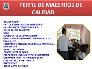 El documento presenta los perfiles de maestros de calidad y maestros iniciales y en formación de calidad para la Escuela Normal Superior MarÃa Auxiliadora de Girardot. El perfil de maestros de calidad incluye características como ser comunicador, gestor, diseñador, líder, constructor de conocimiento, respetuoso del ritmo de aprendizaje de los estudiantes, entre otros. El perfil de maestros iniciales y en formación incluye características como ser significativo, activo, productivo, innovador, acompañante, capac