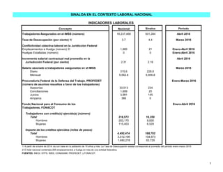 Este documento proporciona información laboral para el estado de Sinaloa, México en mayo de 2016. Resume los principales indicadores laborales como la tasa de desempleo (4.4%), el salario promedio mensual ($6,956.8 pesos), y el número de personas atendidas y colocadas por los programas del Servicio Nacional de Empleo (52,486 atendidas y 13,740 colocadas). Además, compara estos indicadores con los datos a nivel nacional para dar contexto a la situación laboral en Sinaloa.