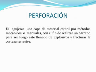 La perforación se utiliza para agujerear capas de material y realizar barrenos que luego se llenan de explosivos para fracturar la corteza terrestre. Existen diferentes métodos de perforación como mecánicos, químicos, térmicos y más. La perforación subterránea se realiza con equipos como jumbos para construir túneles, mientras que la perforación a cielo abierto utiliza equipos sobre neumáticos, orugas o camiones.