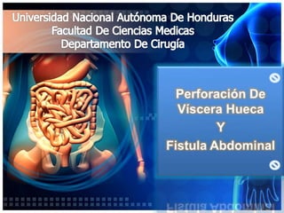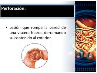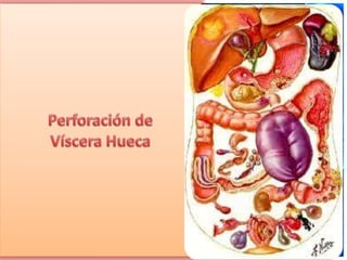 Las perforaciones de vísceras huecas pueden ocurrir por diversas causas como úlceras pépticas, diverticulitis aguda, neoplasias gastrointestinales o perforaciones quirúrgicas. Presentan dolor abdominal intenso y pueden causar peritonitis. El tratamiento quirúrgico es necesario para reparar la perforación y drenar el contenido intestinal filtrado.