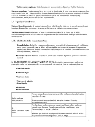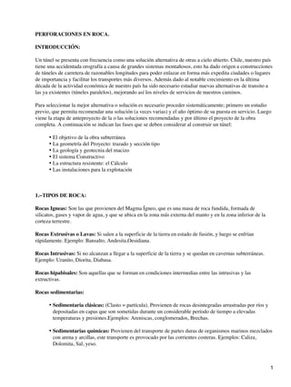 El documento describe los diferentes tipos de rocas y métodos de excavación en túneles. Detalla las características de rocas ígneas, sedimentarias y metamórficas y cómo afectan al costo y dificultad de la excavación. Explica los diferentes métodos de excavación con explosivos, máquinas y máquinas integrales presurizadas, y cómo se selecciona el método dependiendo del tipo y dureza de la roca. También cubre aspectos como la sección transversal típica de un túnel y diagramas de perforación